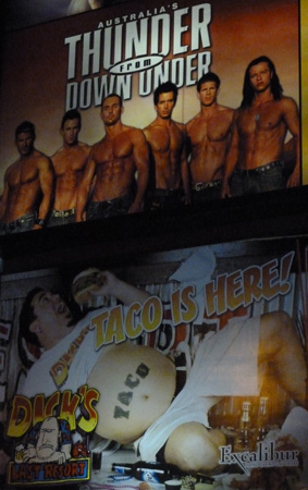 I didn’t eat at Dick’s Last Resort – the restaurant advertised here but I like the way they paired Fat Dick with the buffed boys of Thunder From Down Under in the photo of a billboard above. Nice juxtaposition.