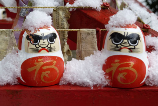 These lucky red Buddhas shot outside a temple will bring good luck and help make your wishes come true. I love their snowy caps.