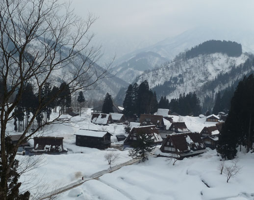 Traditional gassho-zukuri-style thatched roof tops peeping out of the snow in the Gokayama villages in the Hokuriku region of Japan which is famed for its heavy snowfall.